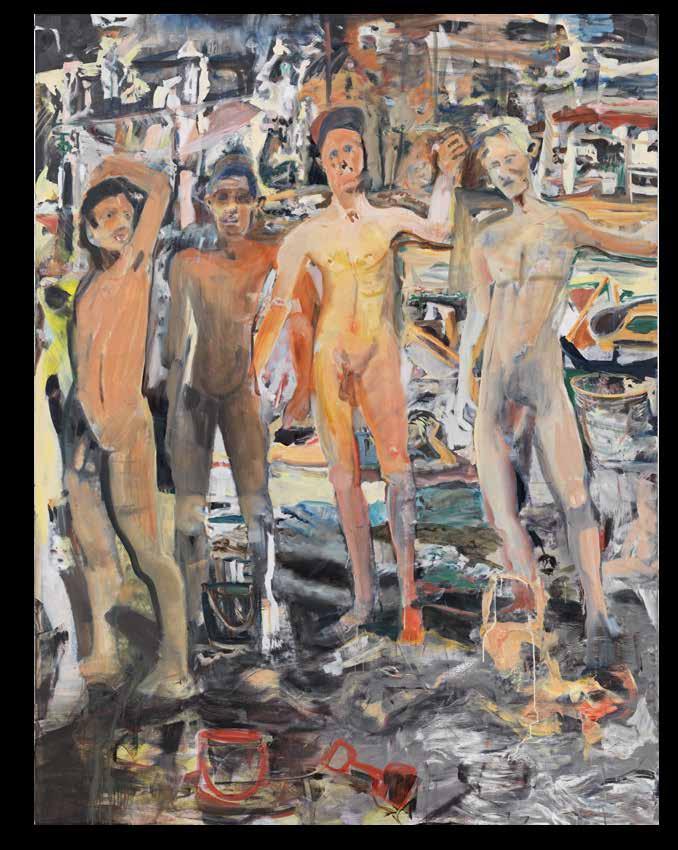 Als ich mich zum ersten Mal einer Serie männlicher Akte von Cecily Brown näherte – „Reclining Blonde with Nudes“, „Blue Sky with Nudes“, „Bucket and Spade with Nudes“, „Straw Hat with Nudes“ –, ließ mich etwas, das wohl mit meiner Biografie zusammenhängt, auf die Knie der Dargestellten fixieren. Und das trotz oder gerade wegen der Tatsache, dass ich aus einer auf den Phallus fixierten Stadt zu Besuch war.