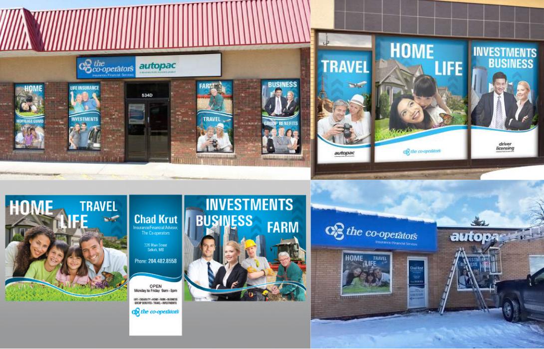 Custom vinyl window graphics for multiple branches of The Co-operators, a Canadian-owned insurance company, showcasing their diverse offerings and client benefits.