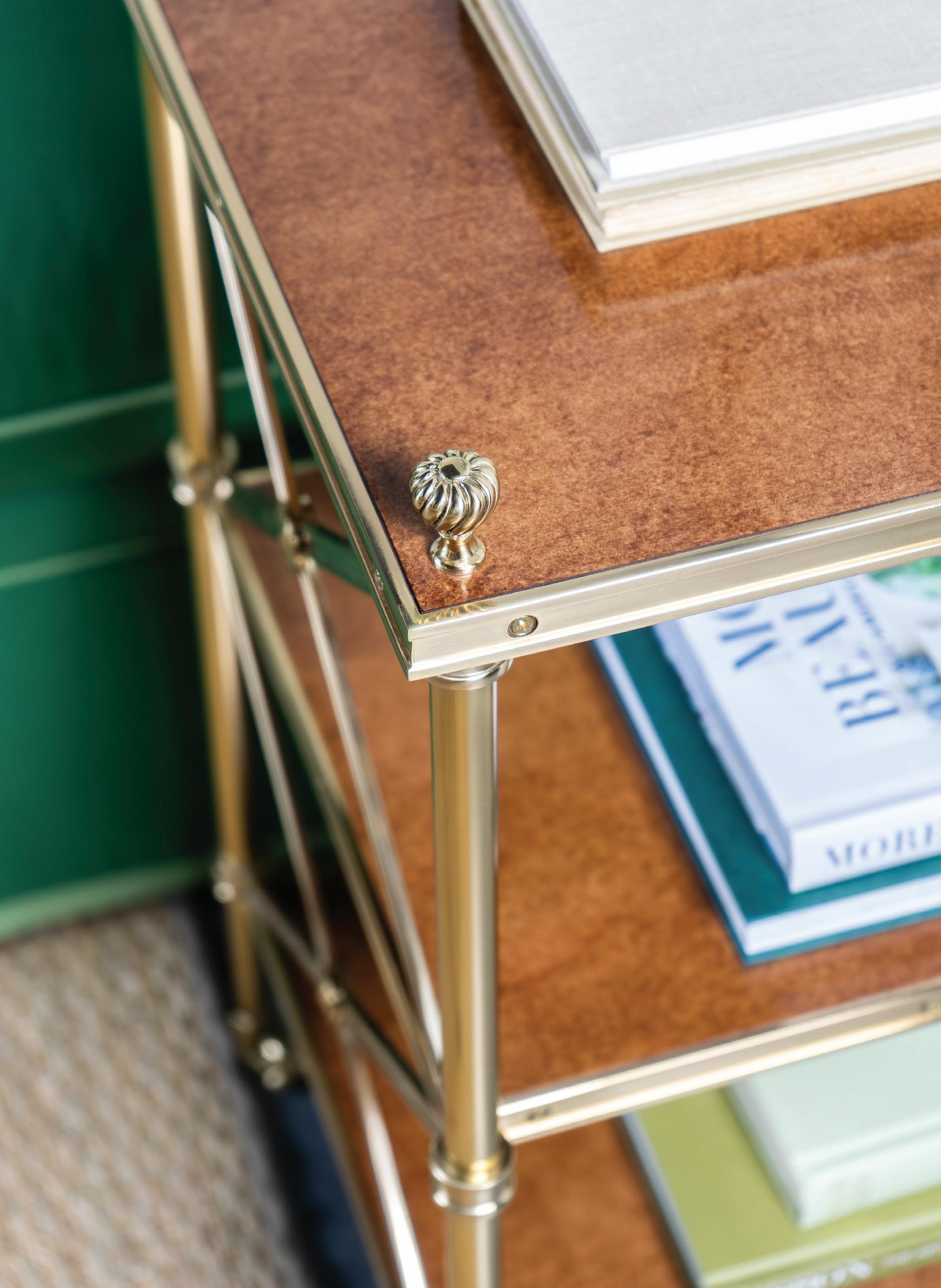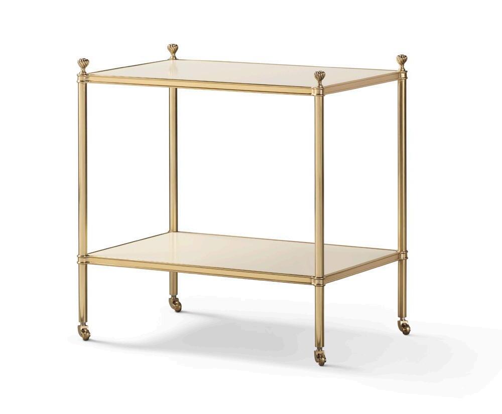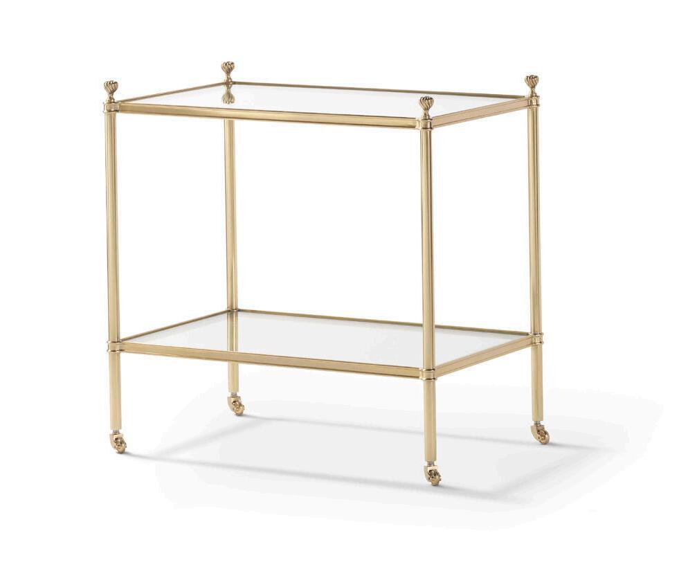A celebration of elegant details, the Acacia Collection features an antique brass frame, legs with delicate castors or tapered leg and finialcapped tops. This versatile collection is ideal for layering lighting, books, or collected objects with a light, elegant touch.