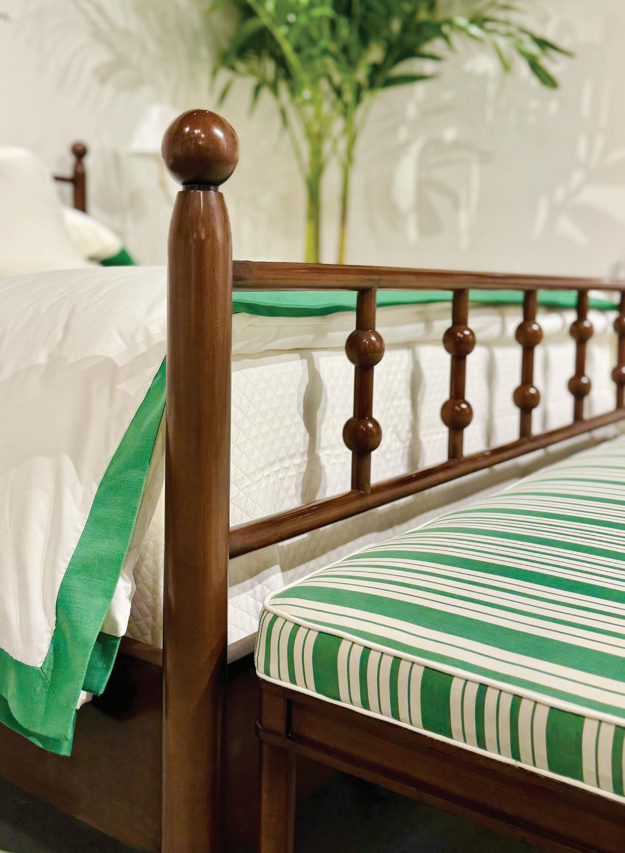 The Privet Bed brings a touch of tradition with a playful twist. Defined by its bobbinturned posts, this piece introduces texture and rhythm to the bedroom. The sculptural frame of bobbin-turned posts give an artisanal presence while the plush seat of the Privet Lounge Chair invites you to settle in. Decorative without excess, and always refined.
