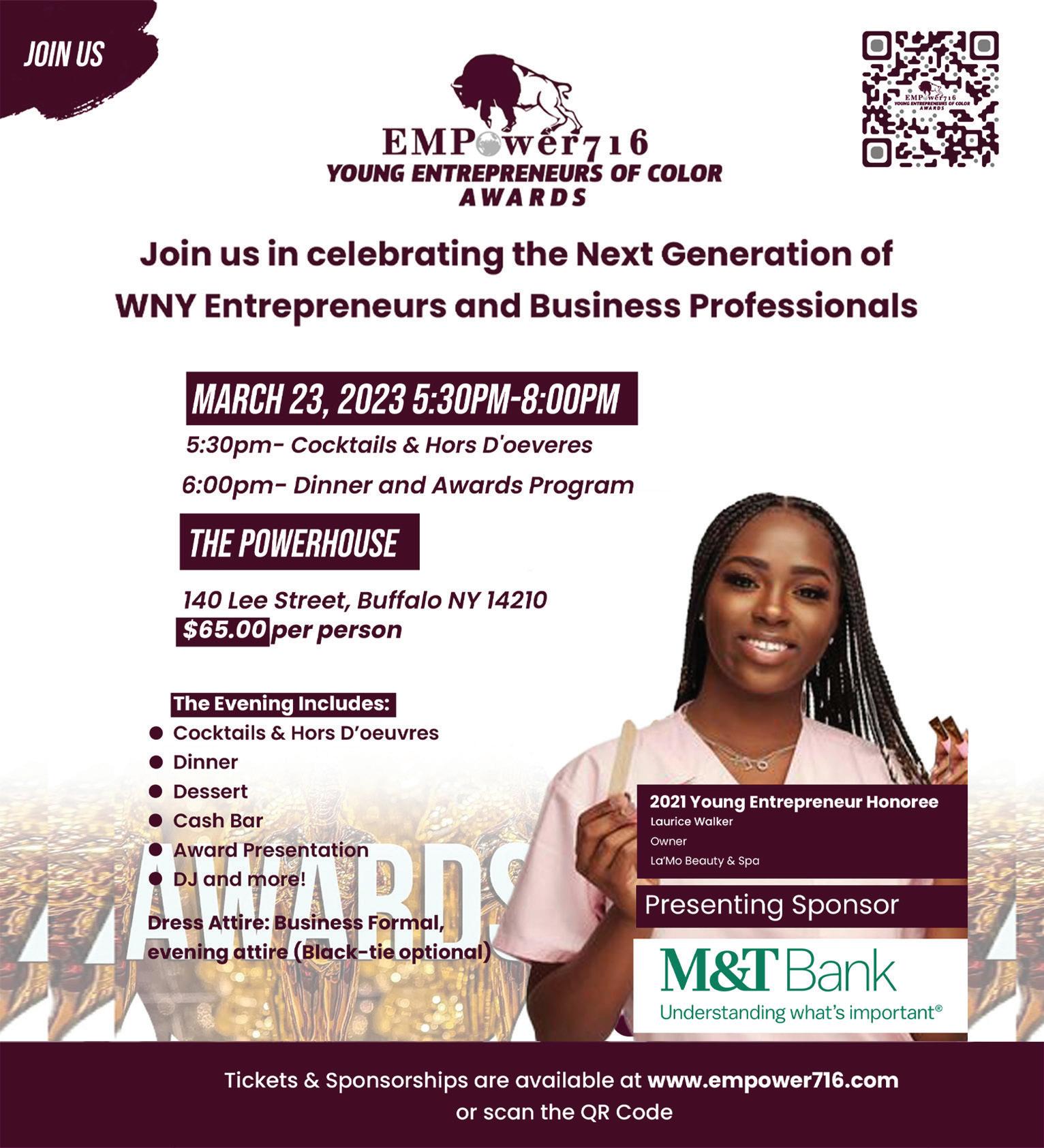 The Empower716 Young Entrepreneurs Recognition Program is holding its first annual Young Entrepreneurs Awards Gala on Thursday, March 23, 2023. The event will celebrate twelve youth startup leaders in Western New York and honor them with the Entrepreneurs of Color Award. One young startup leader will also receive the Dennis Wilson Jr. Entrepreneurial Spirit Award, named after local entrepreneur and business owner Dennis Wilson Jr. of Mrdwilson Limited Corp.