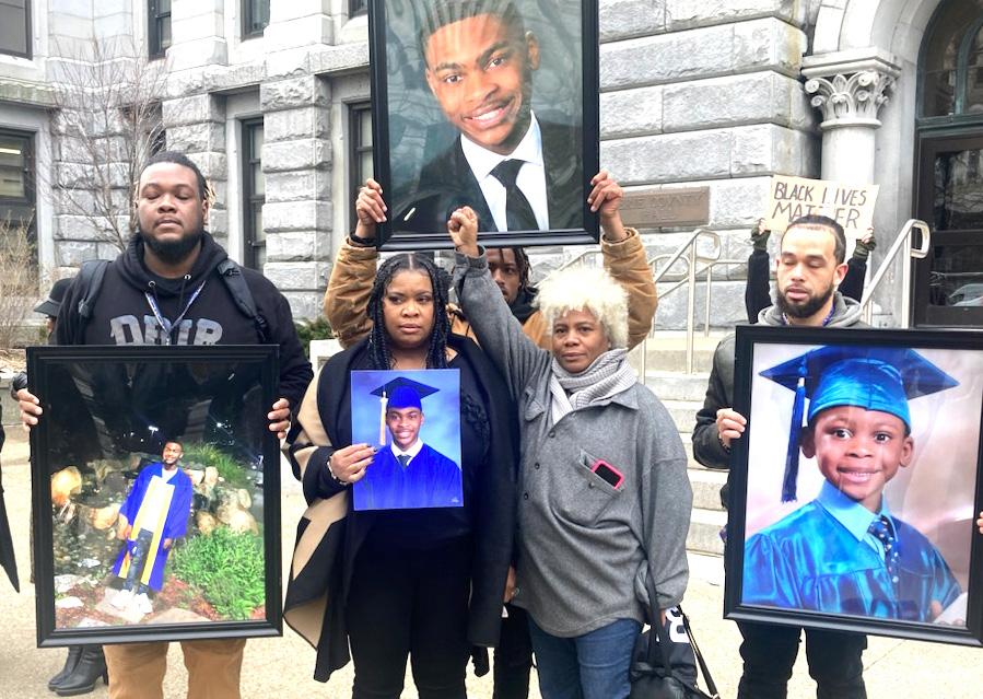 JUSTICE FOR TYLER! The family of Tyler Lewis, the promising young college student who was murdered on UB's Amherst campus in October, was joined by community activists Monday during a press conference where they called for transparency and justice. Authorities have yet to make an arrest in the case. In photo to the left, Tyler's mother (in Black holding a picture of her son) , Mark Talley, Taisiah Stewart , Cariol Horne and Myles Carter. In photo to the right, Taisiah Stewart, Myles and Kobe (Tyler's roommates). STREET LEGACY PHOTOS BY DARVIN ADAMS