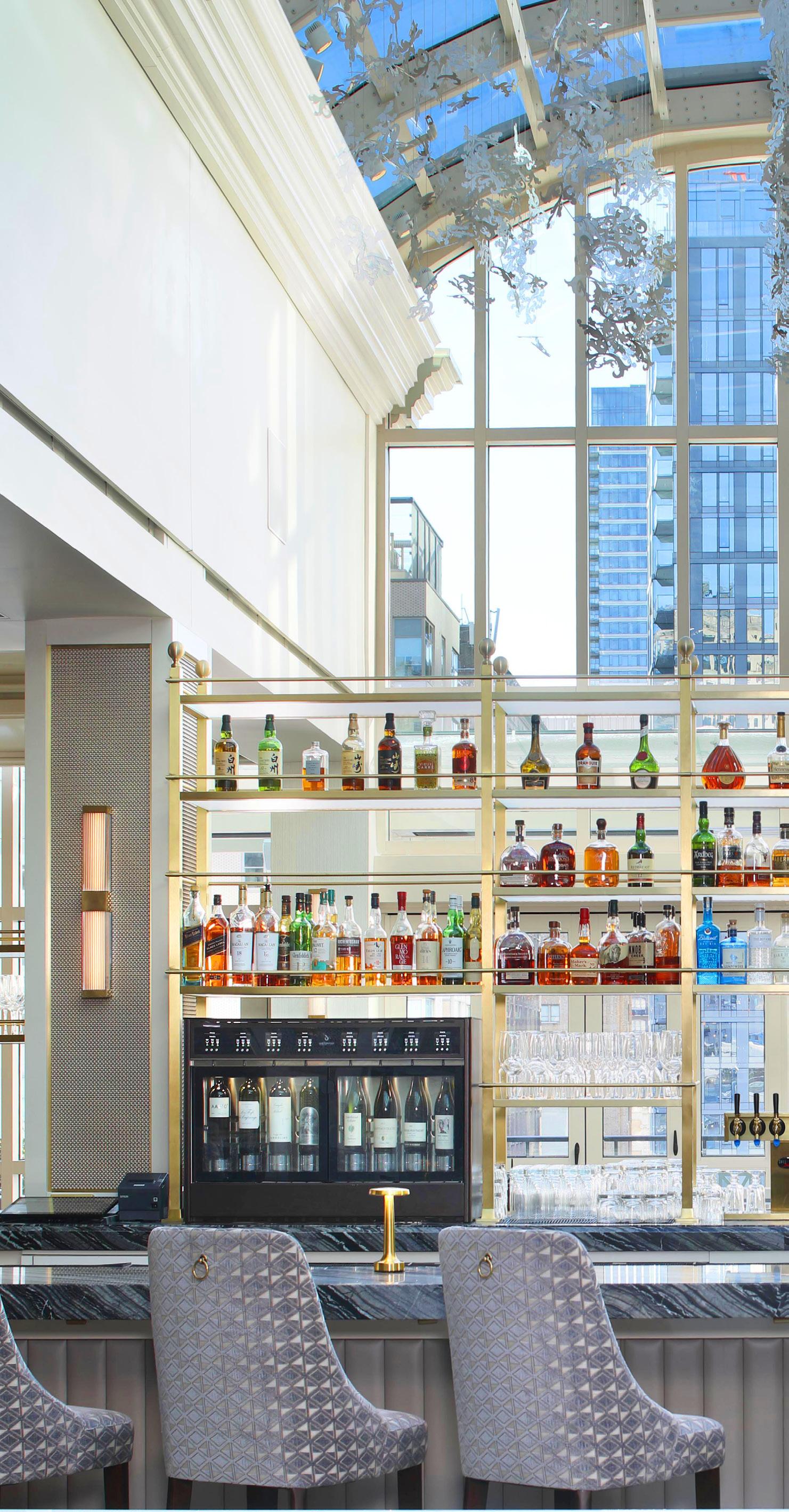 The central skylight, which mimics the shape of the existing arched eyebrow dormers on the building’s exterior, floods the bar area with natural light. A custom art installation hangs from the ceiling and is comprised of shapes that are inspired by the building’s architecture. The reflective properties of the shapes’ anodized aluminum material creates a unique display of moving shadows across the skylight atrium walls, transforming the aesthetic within the atrium as light changes throughout the day.