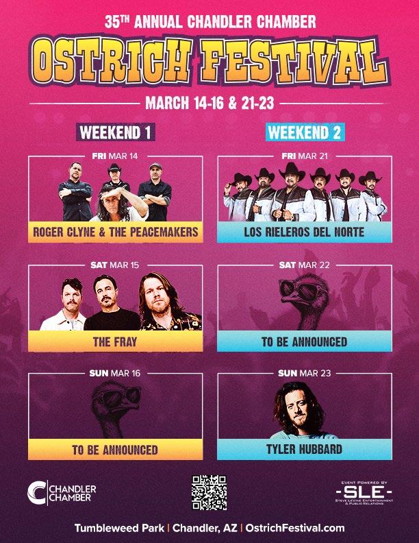 Mark your calendars: the 35th-Annual Ostrich Festival, one of the largest outdoor festivals in the Southwest, is back for two weekends (March 14–16 and March 21–23, 2025)! Headlining acts include Roger Cline & the Peacemakers and Tyler Hubbard, with more artists to be announced. For more information on tickets and sponsorship opportunities, visit ChandlerChamber.com/ OstrichFestival.