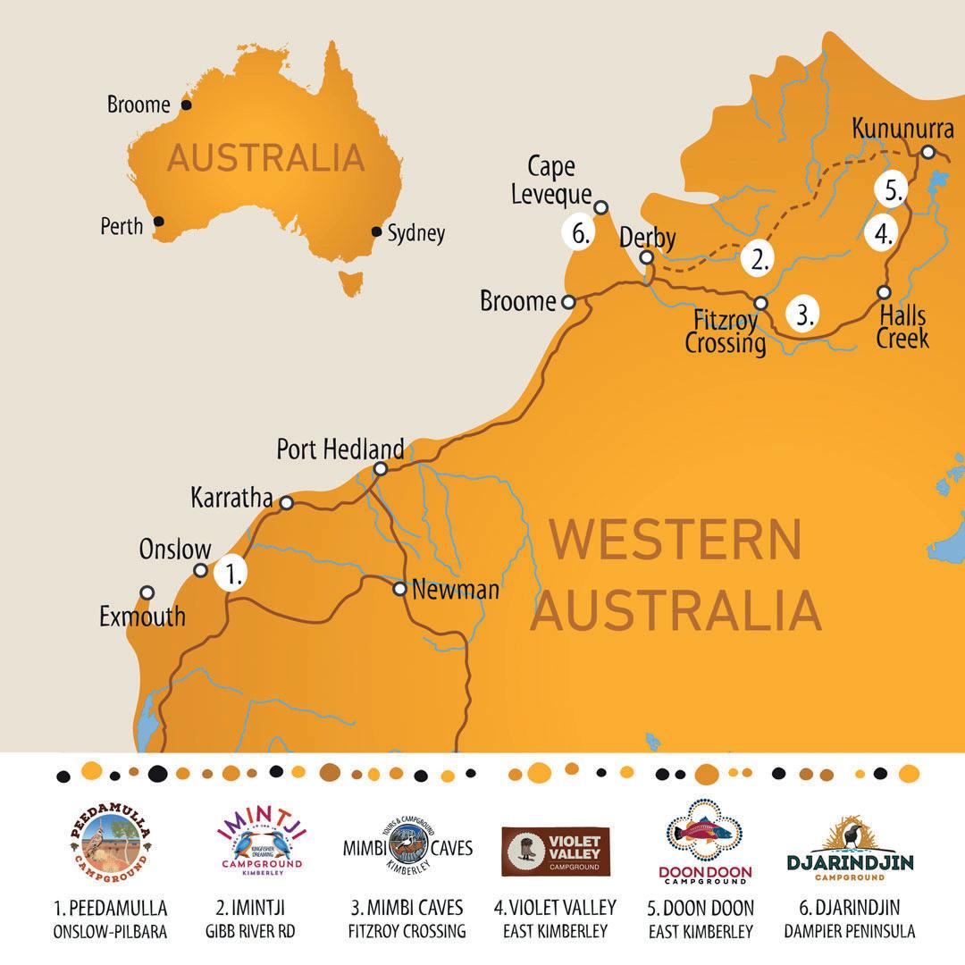 Pilbara’s most remote landscapes, the campgrounds offer a unique opportunity to experience the local way of life. There are currently six locations at Imintji, Mimbi, Violet Valley, Doon Doon Roadhouse and Djarindjin (in the Kimberley) and Peedamulla (in the Pilbara). Each grants access to a host of authentic Aboriginal cultural experiences.