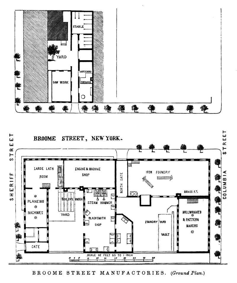 lot on the other side of Broome street, containing their saw works, hardening furnaces, stables, and other necessary buildings. In these works, a bird’s eye view of which is pre-fixed to this paper, and the ground plan of which we here present, the Messrs. Hoe continually employ three hundred men, some of them persons of great ability as draughtsmen, pattern-makers, mechanicians, and the like—men literally of every nation, as nearly as may be, under the sun; among whom are comprised several Armenians, said to be persons of great intelligence and excellent deportment.