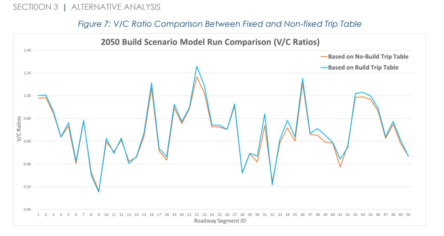 This graph is from the County’s official environmental impact report showing the difference in traffic congestion with and without the 526 extension.The graph summarizes 50 different trip simulations across West Ashley and James and Johns Island, with the travel times shown in orange (Build 526) and blue (No Build 526). As you can see, it’s a tiny difference – just a 1% change.