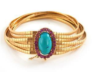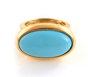 ruby and diamond accented by approx. 10 x 14mm turquoise cabochon in 14K setting, stamped: 14K, PLI, India, size 8.75, and 10.0g all in