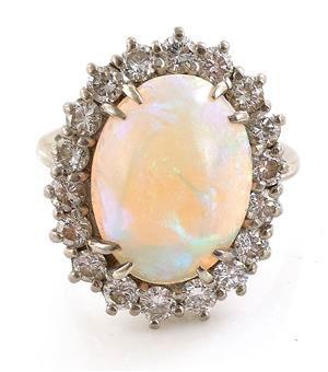 oval cabochon opal, approx. 5.0ct (11.5x15.5x5.2mm), accented by 18 small full-cut diamonds, in 18K white gold openwork setting, size 6.5, and Total 8.2g all in