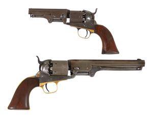 Model 1849 Pocket, 31-cal, single-action percussion revolver, brass trigger guard and backstrap, walnut grip, barrel L4", overall L9 3/4" (2pcs)