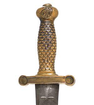 double edge blade with three-paneled fuller, solid brass hilt with scaled grip and cast eagle on pommel; stamped: AMES MFG CO., CHICOPEE, MASS, and U.S./ADK/1854; blade L19", and overall L24 7/8"