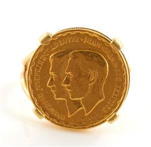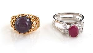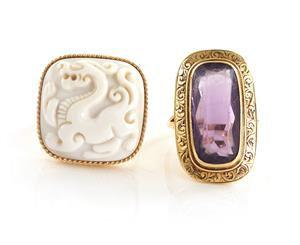 14K and amethyst ring, engraved 1874, size 6 14K and cabochon coral and seed pearl ring, size 7.5