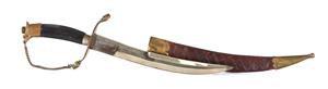 7 American Naval Dirk Dagger with Leather Sheath probably Spanish made, 19th century, scroll decorated blade, lion's head pommel, wood grip, shaped guard with chain, and curved blade; with embossed leather sheath; ricasso marked: PURESTEEL; overall L13"