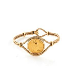 Gold Coin Set in Diamond and Gold Ring coin dated 1986, $5 gold eagle coin, set in 14K gold and small diamonds, ring, size 5 1/2, and Total 10.5g all in