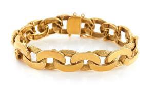 Heavy Gold Bracelet stylized curb links with textured and polished finish; stamped: 18K, L7", and 37.1g