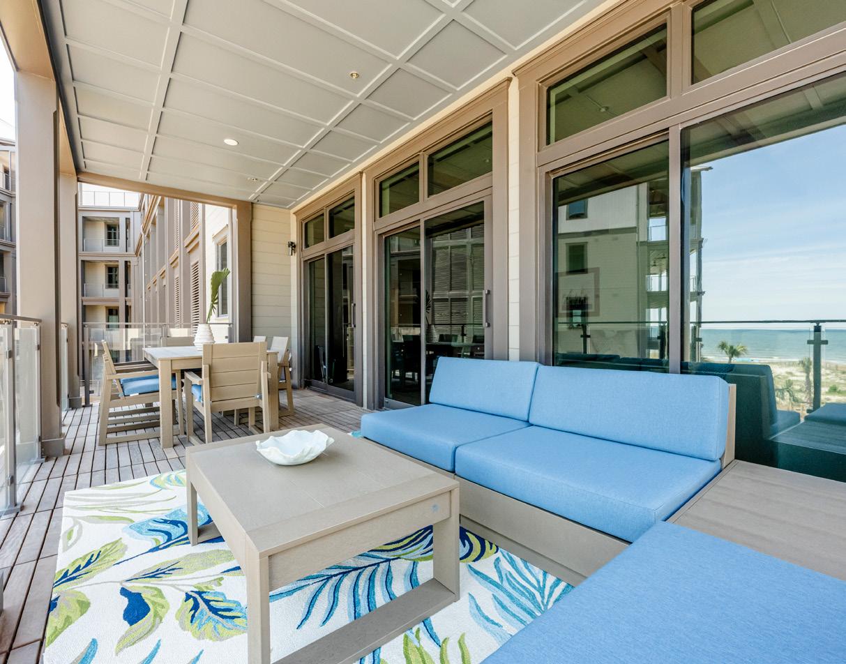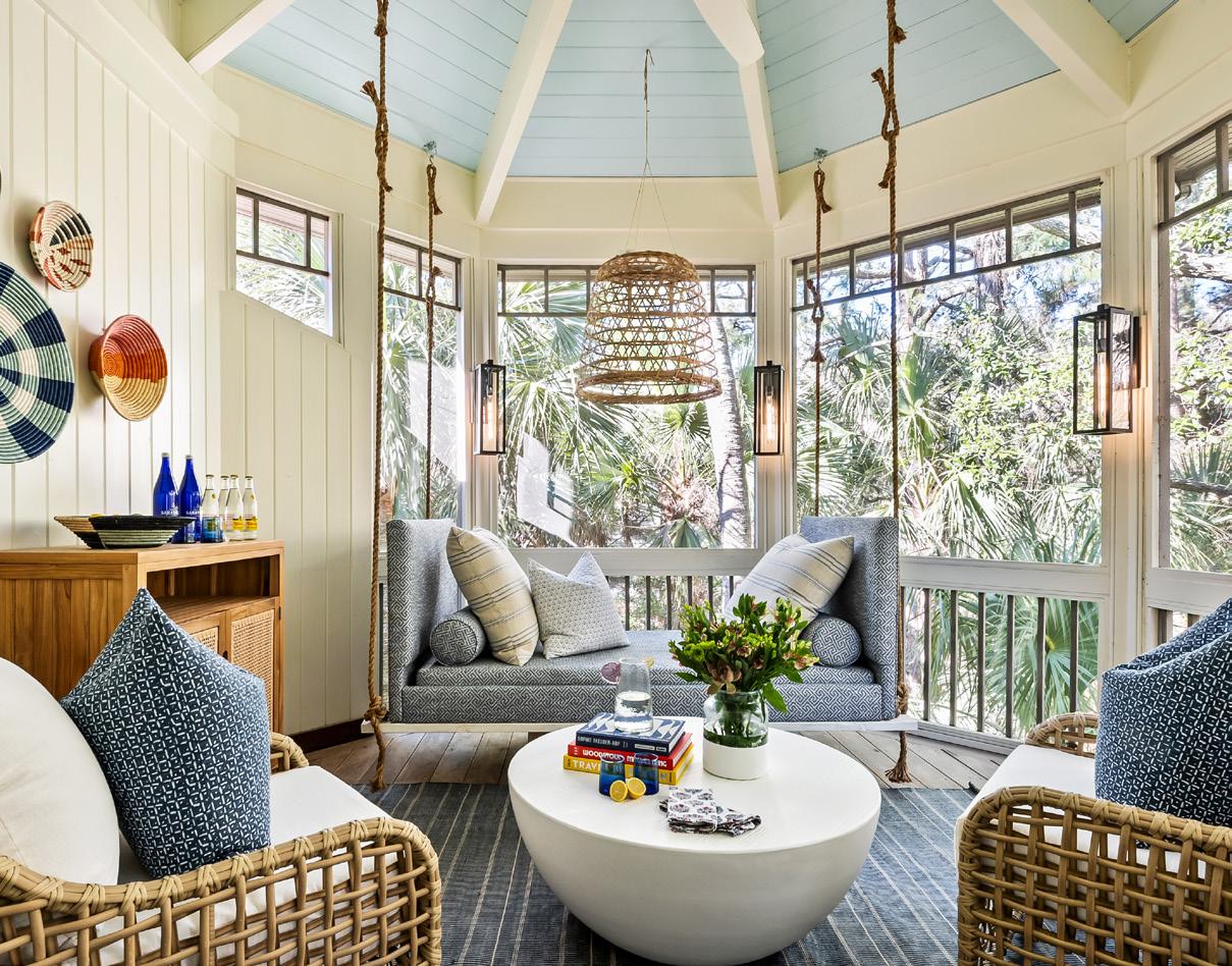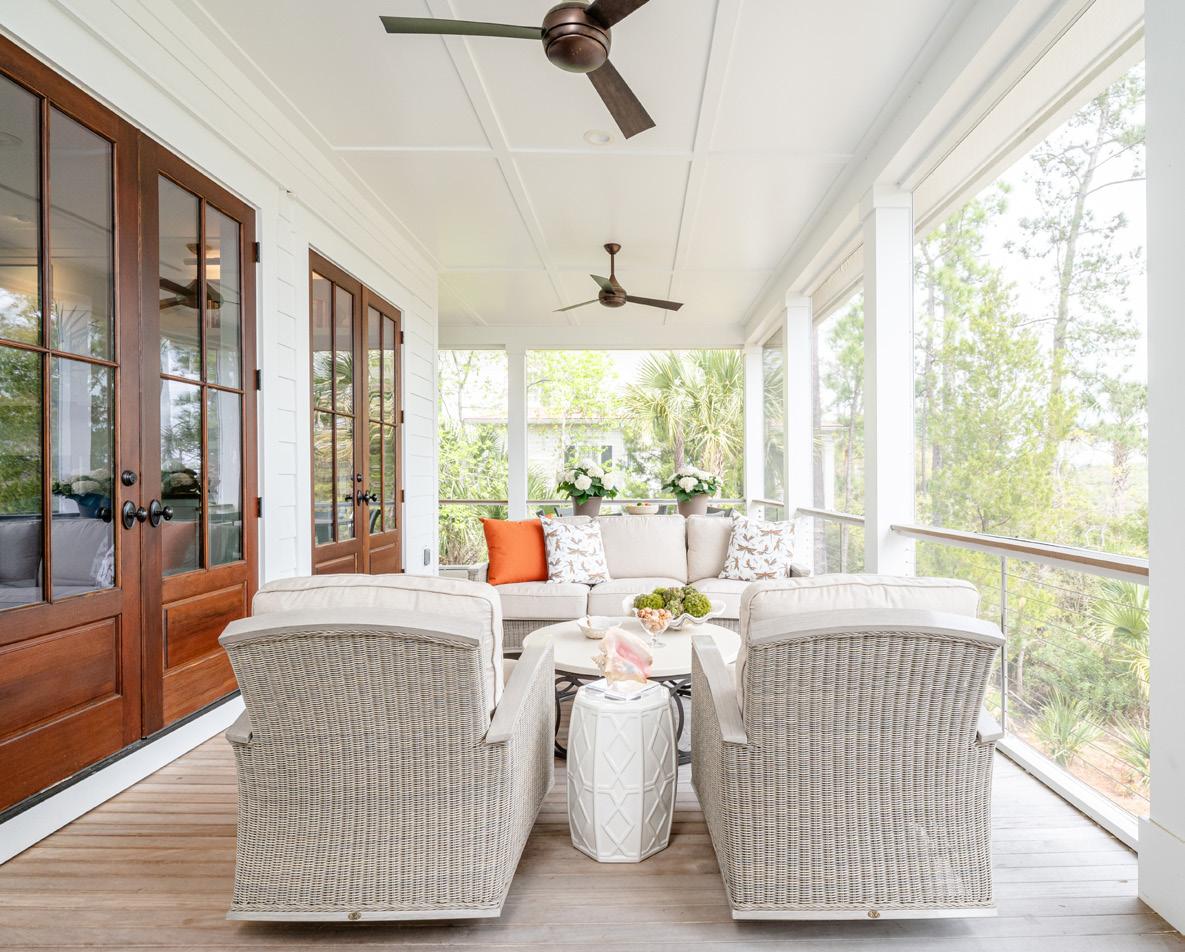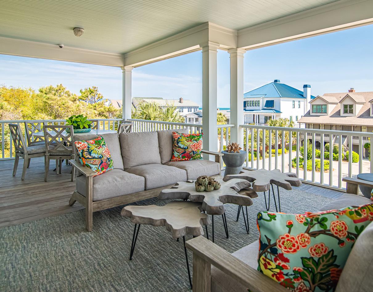 The porches here are as long as the entire length of the house and successfully capture the sea breezes. Gathering on these porches is easily accommodated with plenty of relaxed seating and outdoor drapery for privacy. Conversations are free and easy, where 'porch life' is enjoyed. The beadboard ceiling is painted in haint blue, and a beautiful railing system, fans, and party lights give the porches a wonderful evening glow.