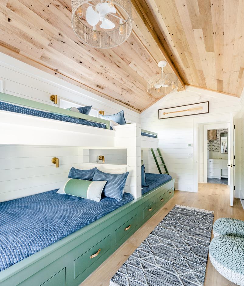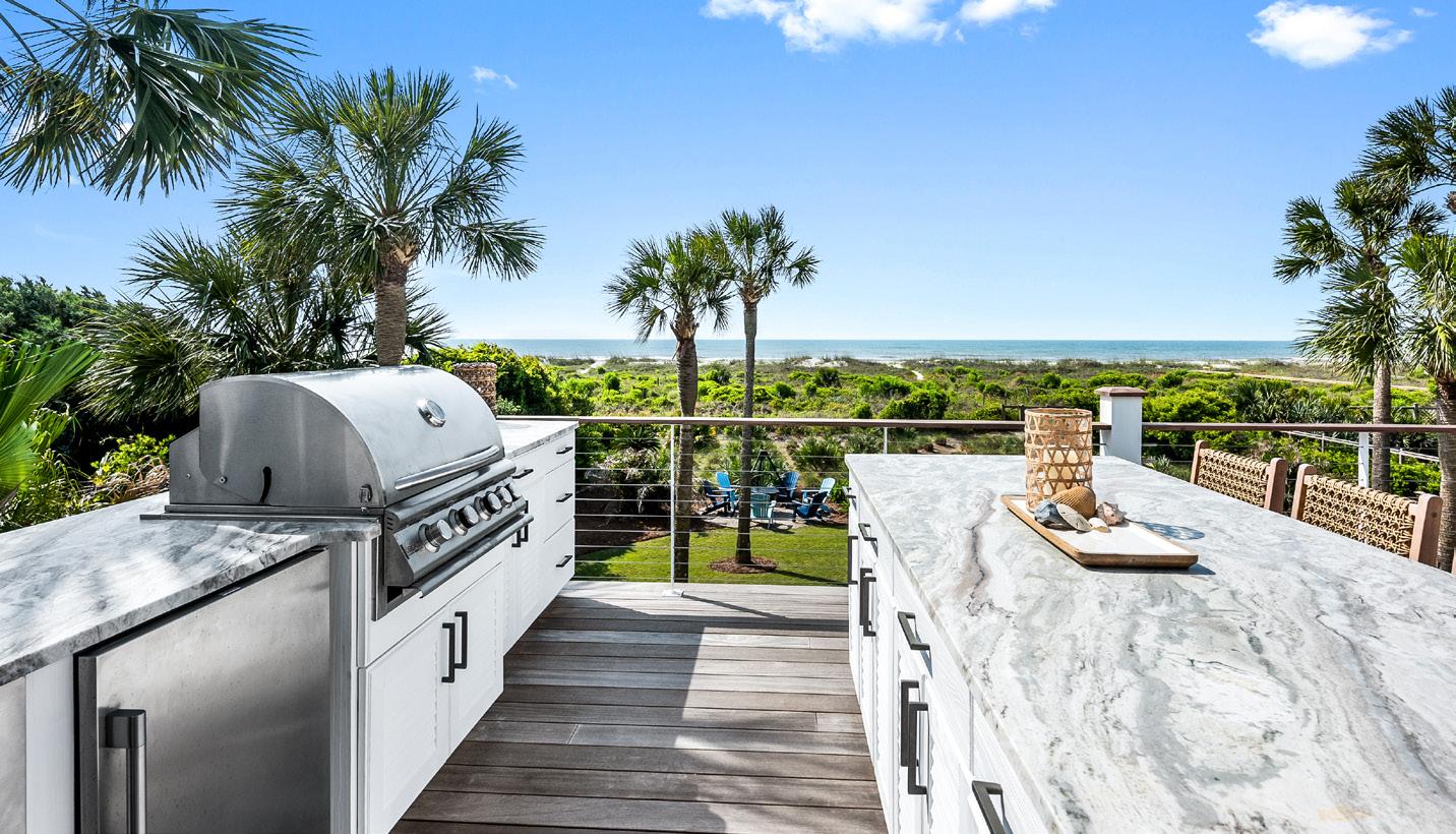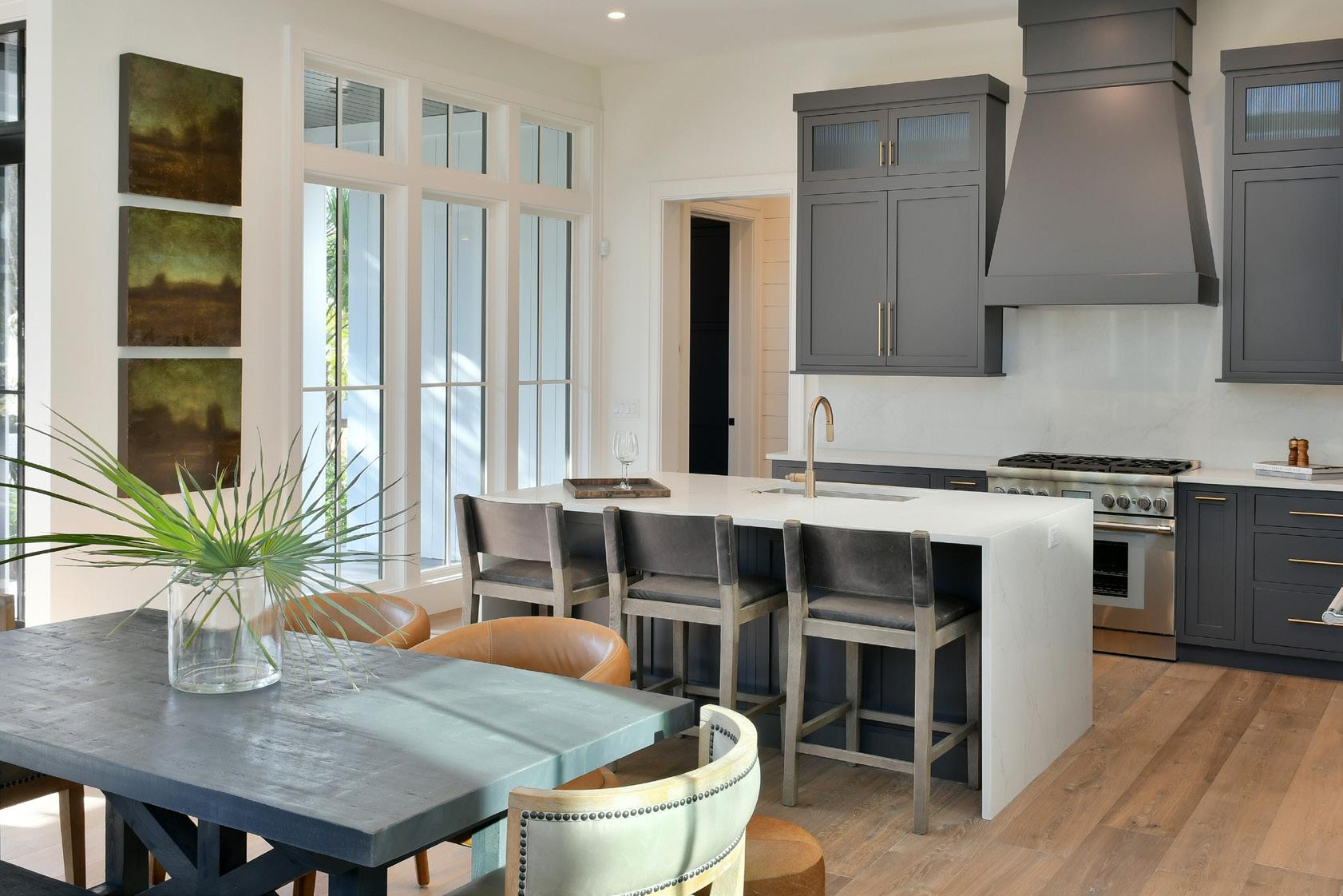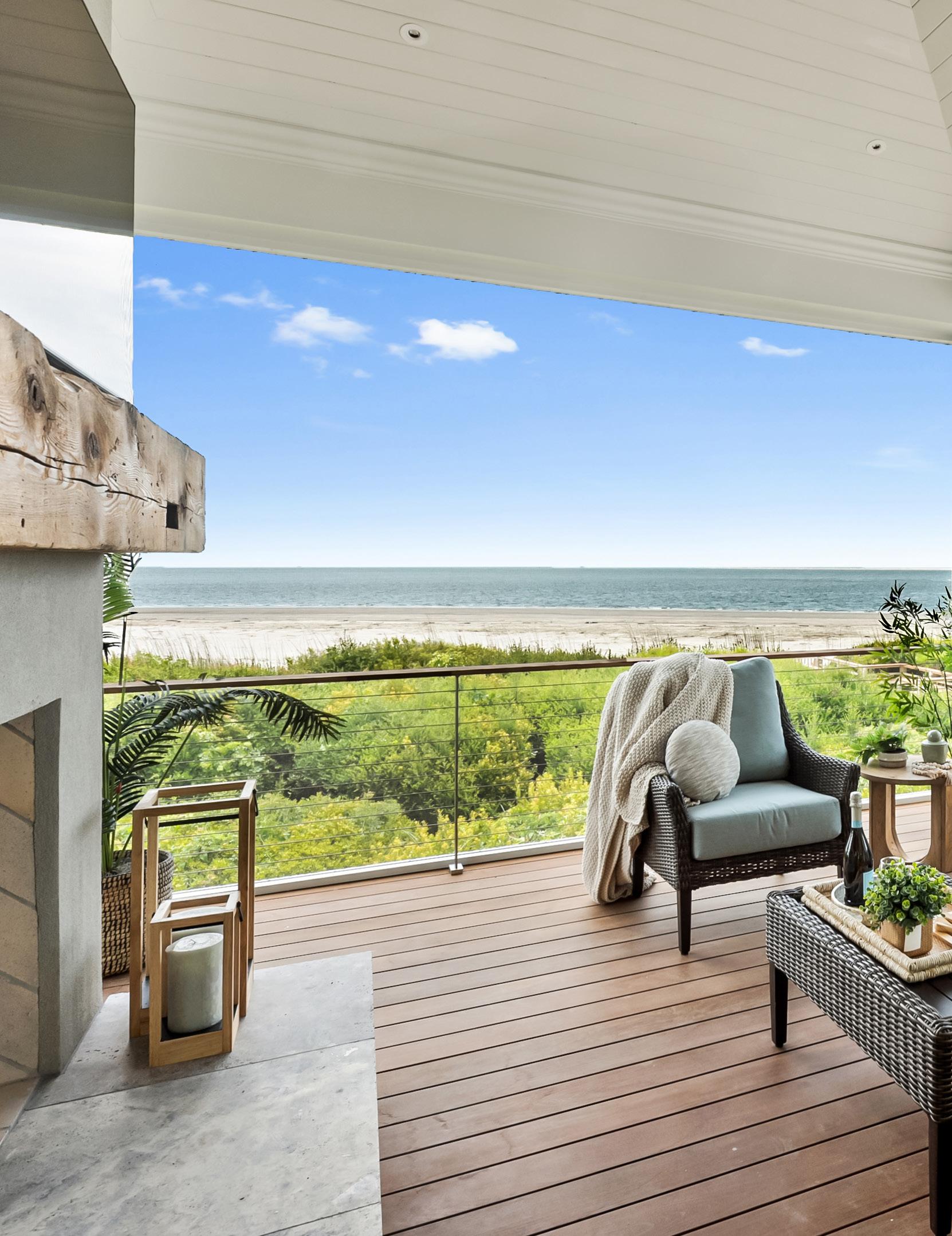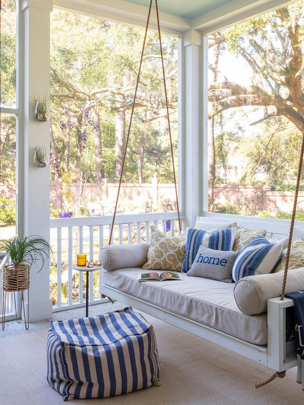 The porches here are as long as the entire length of the house and successfully capture the sea breezes. Gathering on these porches is easily accommodated with plenty of relaxed seating and outdoor drapery for privacy. Conversations are free and easy, where 'porch life' is enjoyed. The beadboard ceiling is painted in haint blue, and a beautiful railing system, fans, and party lights give the porches a wonderful evening glow.