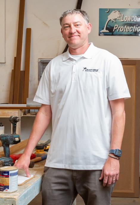 (above) At Lowcountry Hurricane Protection & Shutters, the goal is to ensure top-notch quality in each and every shutter manufactured on-site. (right) These personalized shutters serve a dual purpose; not only through aesthetics, but also the protection of a homeowner's most precious investment—their home.