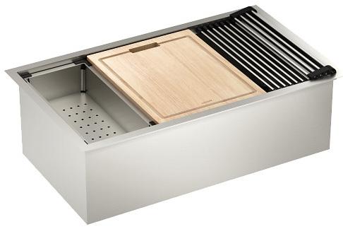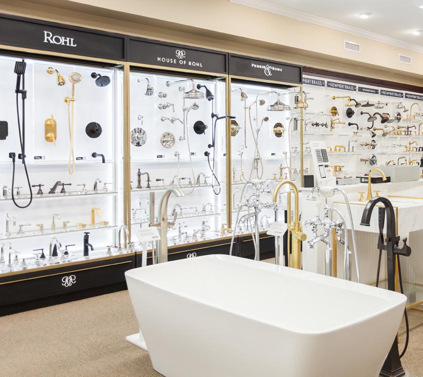 Moluf’s Supply showroom greets visitors with a live shower display as you walk toward the center of the space where dozens of shower heads and wall-mounted fixtures sit among glass-cased display with ample illumination to see each detail with clarity. Handles on the outside correspond with the different shower fixtures featuring varying levels of water pressure and water features to test for yourself. Further inside, a space is dedicated fully to kitchen elements mirroring the opposite side set up exclusively for bathroom fixture needs which include a wide range of decorative basins and freestanding tubs.