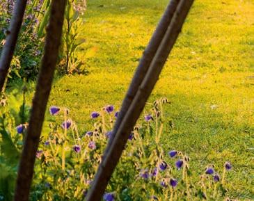 Opposite The sun rises over a parkland meadow studded with camassia and red campion. This image The Hot Banks on the terrace with plant supports made from found garden materials.