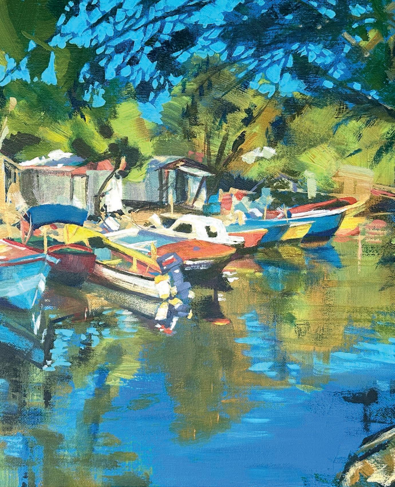 I chose this photo of fishing vessels moored in a river-mouth, where they spend the day, safe from coastal squalls. I love the scene’s composition, framed by trees and water. The ramshackle fishermen’s huts are just visible behind the string of fishing vessels. Primary colours draw the eye into the scene. I sought to capture the feeling of sunshine and tranquility in a fun, bright painting, using playful, bold and blocky brushwork. By mixing and blending minimally and working with quality paints, the colours stay clean and bright. A limited palette helps to harmonise the view. susanclare.art