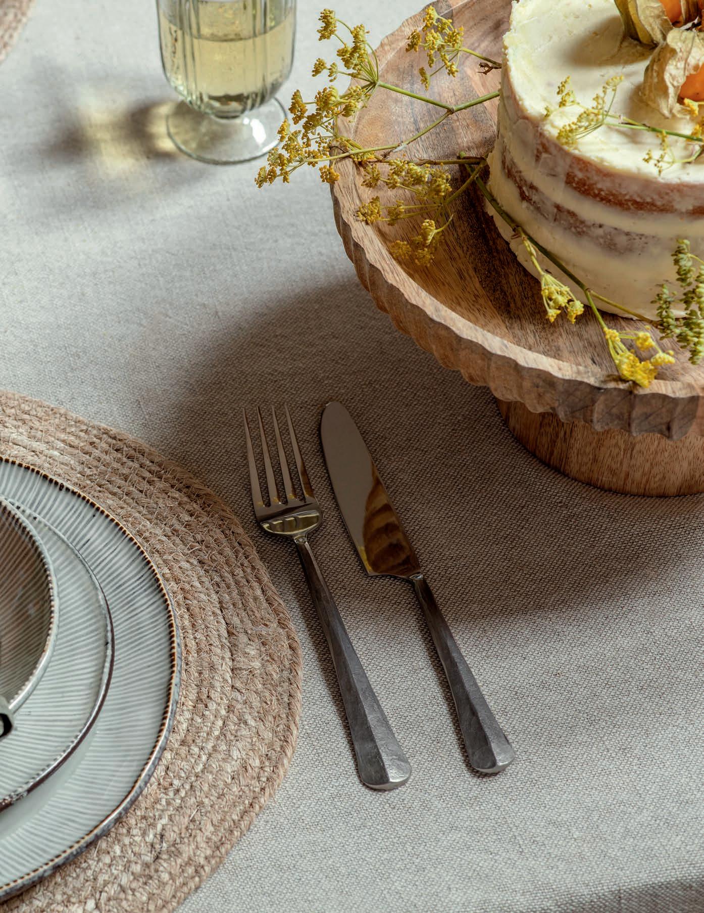 Sanee table runner, £50, and napkins, £20 for a set of two; Keso woven placemats, £40 for a set of four; Osko 16-piece cutlery set, £185; Malia 12-piece dinnerware set, £225; Sigiri small wine glasses, £40 for a set of four; Gavivi mango wood cake stand, from £60 (small), all Nkuku