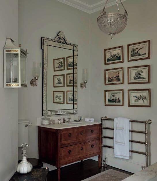 were some of the most desired materials. Salata believes the charm is in not overrestoring. “Glossy woods, intricate carvings and tufted upholstery are all synonymous with the period, let them clash with your more-contemporary pieces,” she says. Think a Regency mirror above a brushed-steel fi replace: “The tension is what makes it work”.