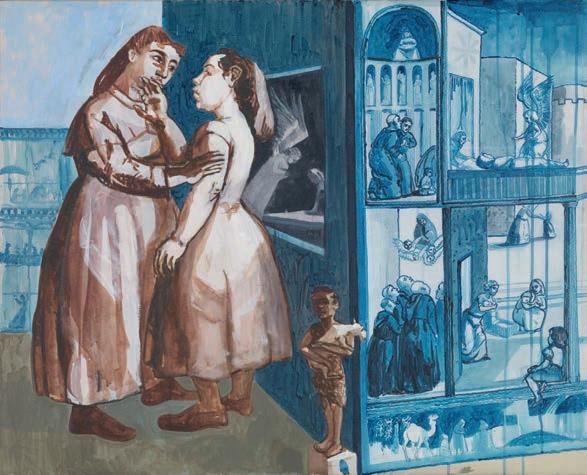 PRIME POSITION Above: Two of Paula Rego’s studies for Crivelli’s Garden – four murals depicting the lives of female saints painted for the National Gallery’s restaurant – hang in the prime minister’s Downing Street residence. The Visitation depicts St Elizabeth telling her cousin Mary, the mother of Jesus, that despite being past child-bearing age, she’s expecting a child. Meanwhile, St John the Baptist can be seen in the background holding a lamb