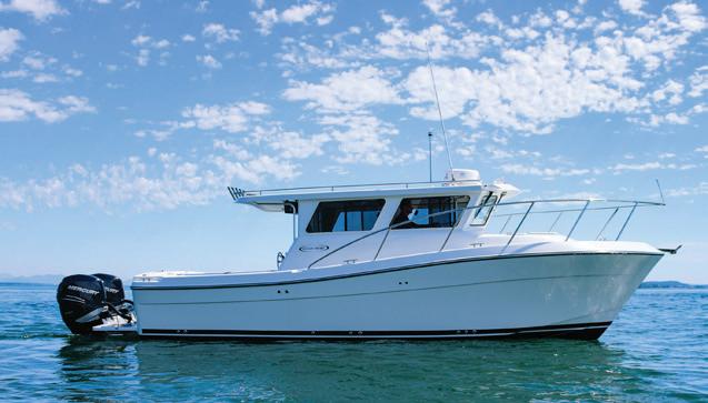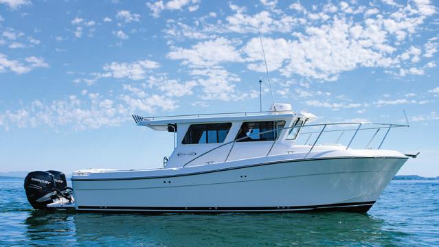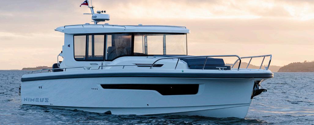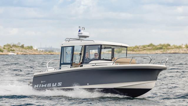 The Nimbus C11 has a well-balanced, air-lubricated twin stepped hull with good high-speed characteristics combined with a low-planing threshold. The hull has a sharp bow section for splitting the waves and an added "flare" that deflects water spray so that the boat runs dry.