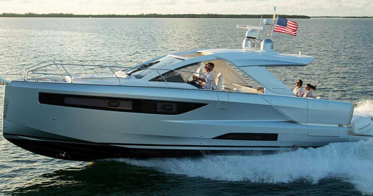 Powered by triple Mercury 350hp Verado outboards, the new Jeanneau is a 43-foot day boat that offers sporty, responsive driving, with top speeds approaching 40 knots and a comfortable cruising speed of about 28 knots. Excellent performance is accompanied by remarkable seakeeping abilities and comfortable cruising, notably due to the hull design by renowned marine architect Michael Peters, with its Scan-inspired “axehead” bow.