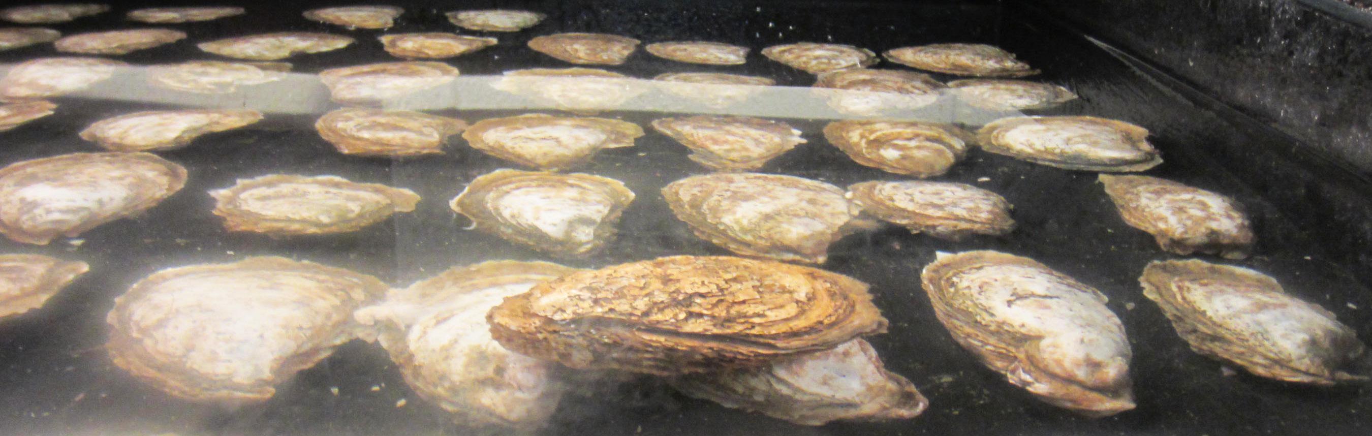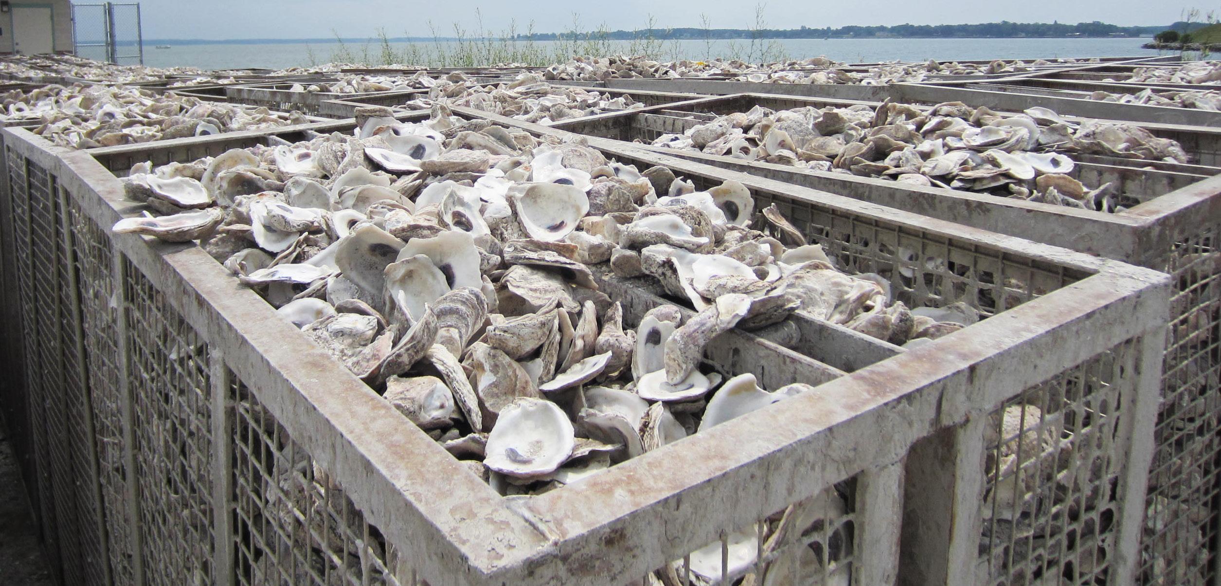 Below: Adult oyster shells are placed in cages, then submerged in huge tanks full of brackish water, then 'set' with oyster larvae, or 'spat.'
