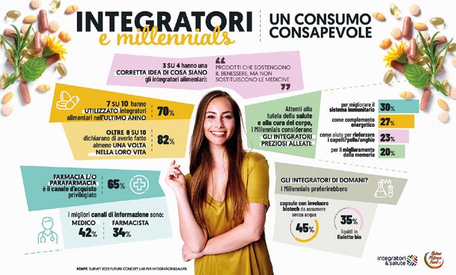 d’acquisto, nonché strumento di sensibilizzazione al corretto utilizzo. I millenials preferiscono acquistarli in farmacie e parafarmacie, solo 1 su 4 li acquista sui siti web specializzati in benessere e salute, in numero ancora minore in negozi di alimenti naturali.