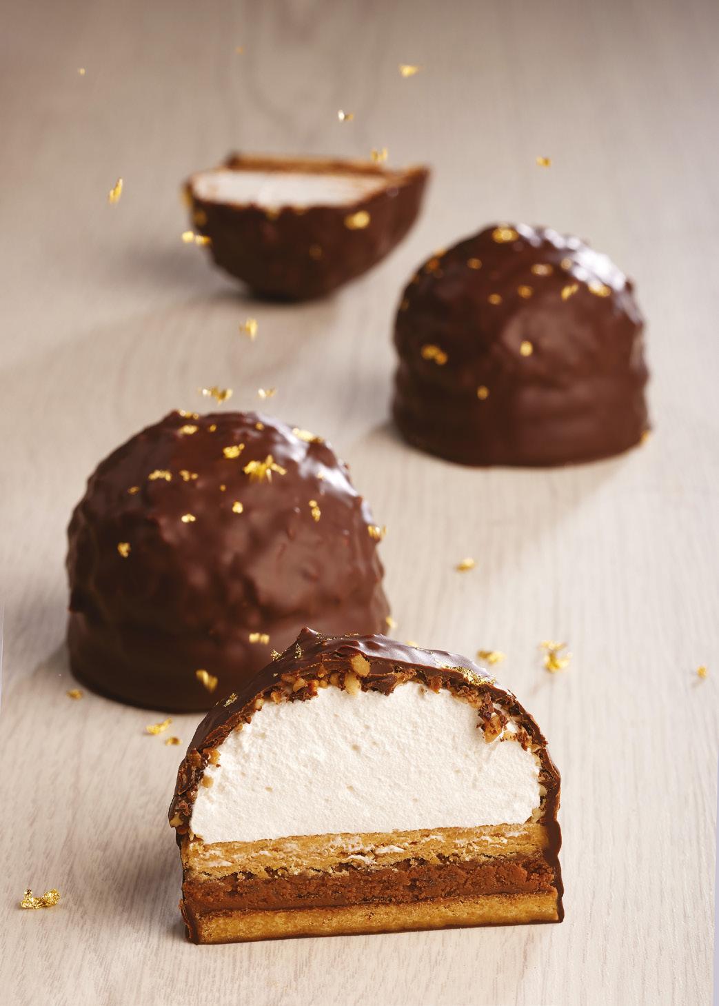 Ispiorandoci al professionista belga Stephan Destrooper, titolare dell’omonima attività a Koksijde, sulla Costa del Mare del Nord, vi proponiamo la nostra versione della sua Melo Cake, in cui preparazioni di pasticceria, cioccolateria e confetteria si unimscono in uno snack di lunga durata, dall’interessante gioco di consistenze. Alla base troviamo una pasta frolla laminata, tagliata e cot ta, sormontata da un filling cremoso, che può essere un ripieno anidro (quindi cremino o gianduia) oppure una ganache. Il tutto completato da una massa montata stile marshmallow. L’abbinamento dei tre elementi può creare combinazioni di gusto e struttura incredibili, che permet tono di spaziare in molteplici abbinamenti strutturali ed aromatici. Analizziamo gli elementi che lo compongono.