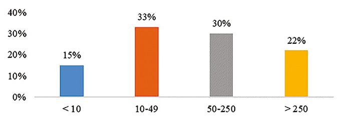 un numero di dipendenti tra 10 e 49 unità (33%) e un fatturato che oscilla tra i 500mila euro fino ai 2 milioni di euro e di medie dimensioni, con dipendenti tra 50 e 250 (30%) e un fatturato che oscilla tra 11-50 milioni di euro. Seguono le grandi imprese con un numero di dipendenti maggiore di 250 unità (22%) e con un fatturato superiore ai 50 milioni euro; e infine le micro-imprese che hanno un numero minore di 10 dipendenti (15%) e un fatturato fino a 500mila euro (Fig. 1).