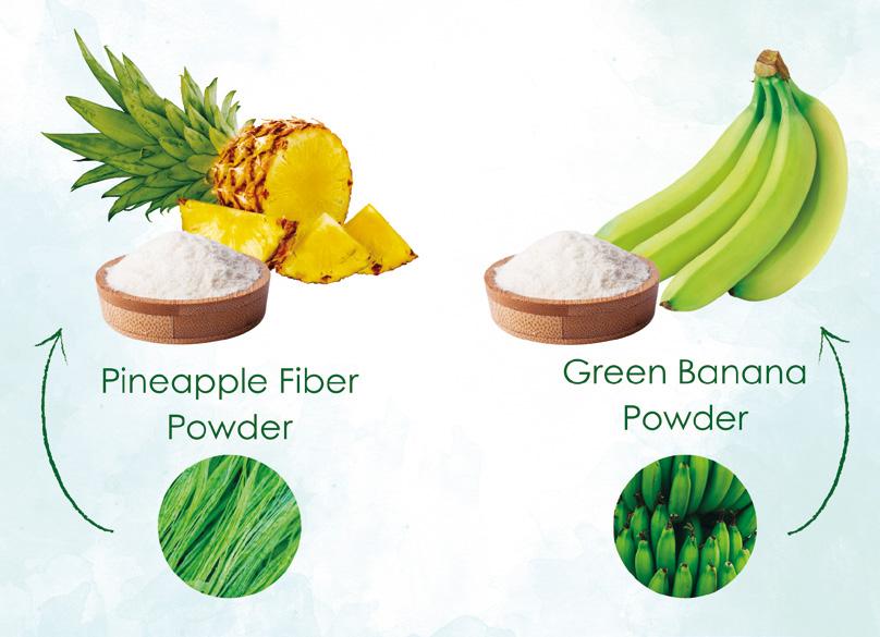 La fibra di ananas in polvere, anch’essa naturale al 100%, dal gusto neutro, ricca di fibre, potassio e magnesio, è un ingrediente funzionale con proprietà texturizzanti ed è stata clinicamente testata come prebiotico.