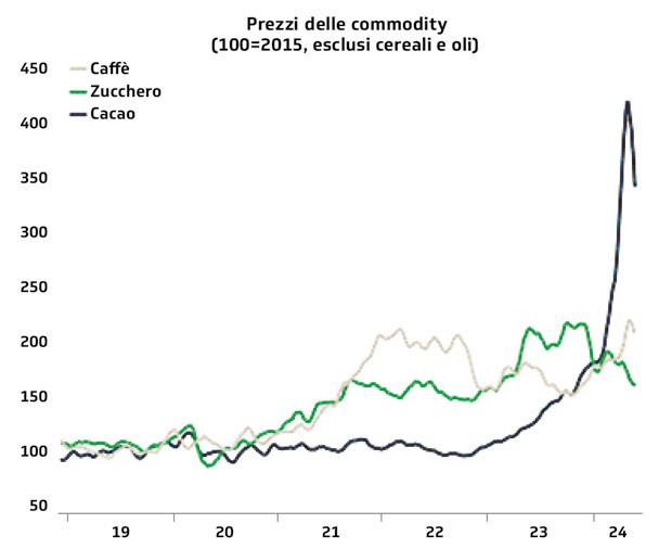 Dopo aver raggiunto ad aprile scorso un record storico (10.000 dollari/t), ben diverso dai picchi del 2009 e 2011 (3.700 dollari/t), con la fine delle celebrazioni di Pasqua i prezzi del cacao sono scesi (7.000 dollari/t). Tuttavia, restano tre volte superiori rispetto a un anno fa e probabilmente rimarranno su tali livelli. L’aumento dei prezzi delle fave di cacao, dovuto in parte alla corsa speculativa sui mercati, riflette, inoltre, un deficit di offerta, problematico a medio termine.