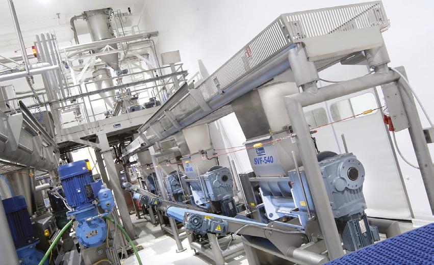 Al giorno d’oggi il livello di automazione nella gestione delle linee di processo dei prodotti freschi della panificazione (prima della cottura) è sempre più spinto e le velocità più elevate: servono quindi soluzioni tecnologiche di movimentazione con caratteristiche similari a quelle delle linee di packaging, considerando in più le zone high care, a contatto diretto col prodotto, che deve garantire igiene e sanificazione elevate, per non intaccare l’integrità e la pulizia del prodotto. Visto il successo delle sue curve e dei nastri a tappeto in sanitary design, concepiti cioè per una massima resa igienica della linea, è stata sviluppata una versione sanificabile e lavabile di due dei moduli di smistamento e trasporto: