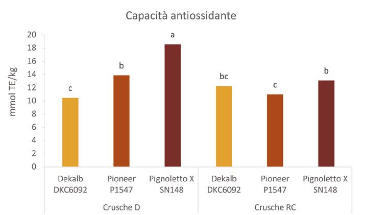 si è osservato un livello di acidi fenolici insolubili significativamente maggiore rispetto a quanto riscontrato negli stessi campioni degli altri ibridi (circa 2 volte superiore rispetto alla media di DKC6092 e P1547). L’accumulo di acidi fenolici nella crusca da raffinazione è risultato mediamente inferiore rispetto a quello da degerminazione (-33%), tuttavia sono emerse differenze tra ibridi: la concentrazione è risultata simile per Pignoletto X SN148 e P1547 (rispettivamente 1.063 e 1.140 mg/kg), mentre per DKC6092 sono stati osservati valori significativamente maggiori (2.625 mg/ kg), anche rispetto alla crusca da degerminazione (+10%). Tali risultati incoraggiano la possibilità di impiego di sottoprodotti della macinazione, come le crusche, per l’arricchimento di semole raffinate o altre matrici alimentari, e