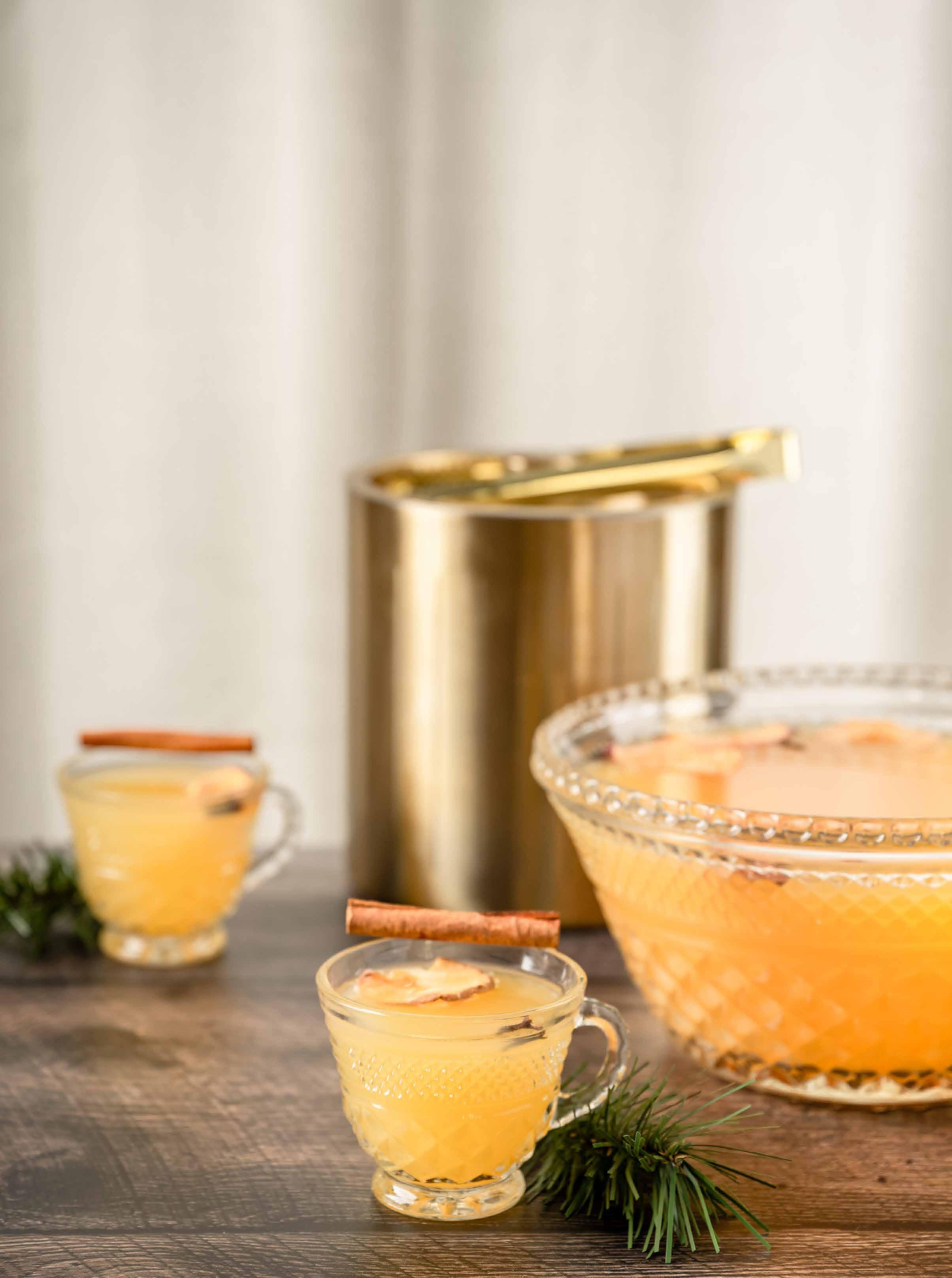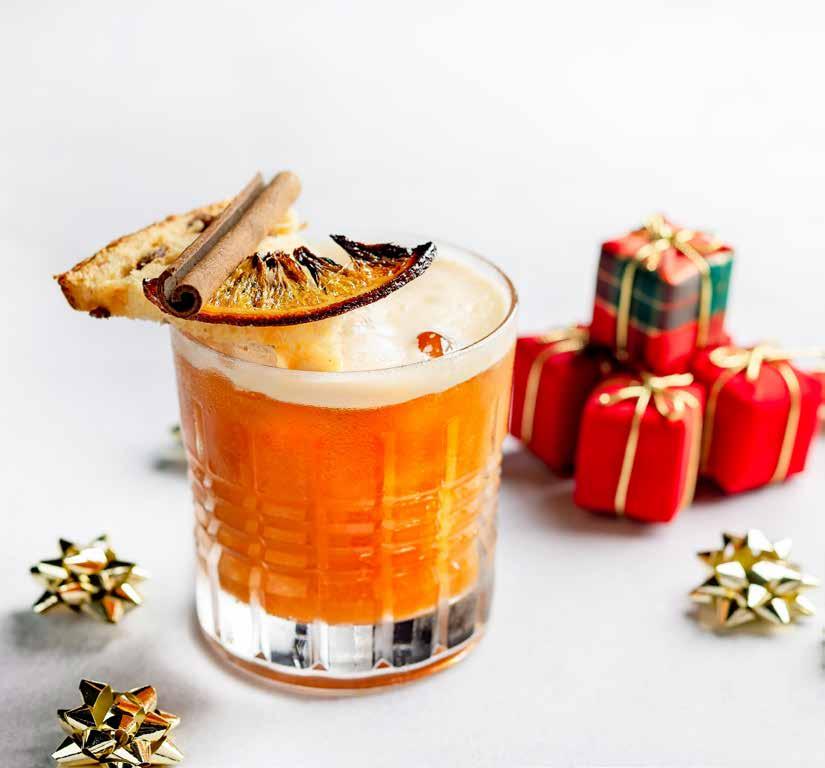 Shake all ingredients (but sparkling wine) with ice, double strain into a glass, top with sparkling wine in a Coupe or Cocktail glass. Garnish with cinnamon stick, star anise, grated nutmeg, and an orange peel.