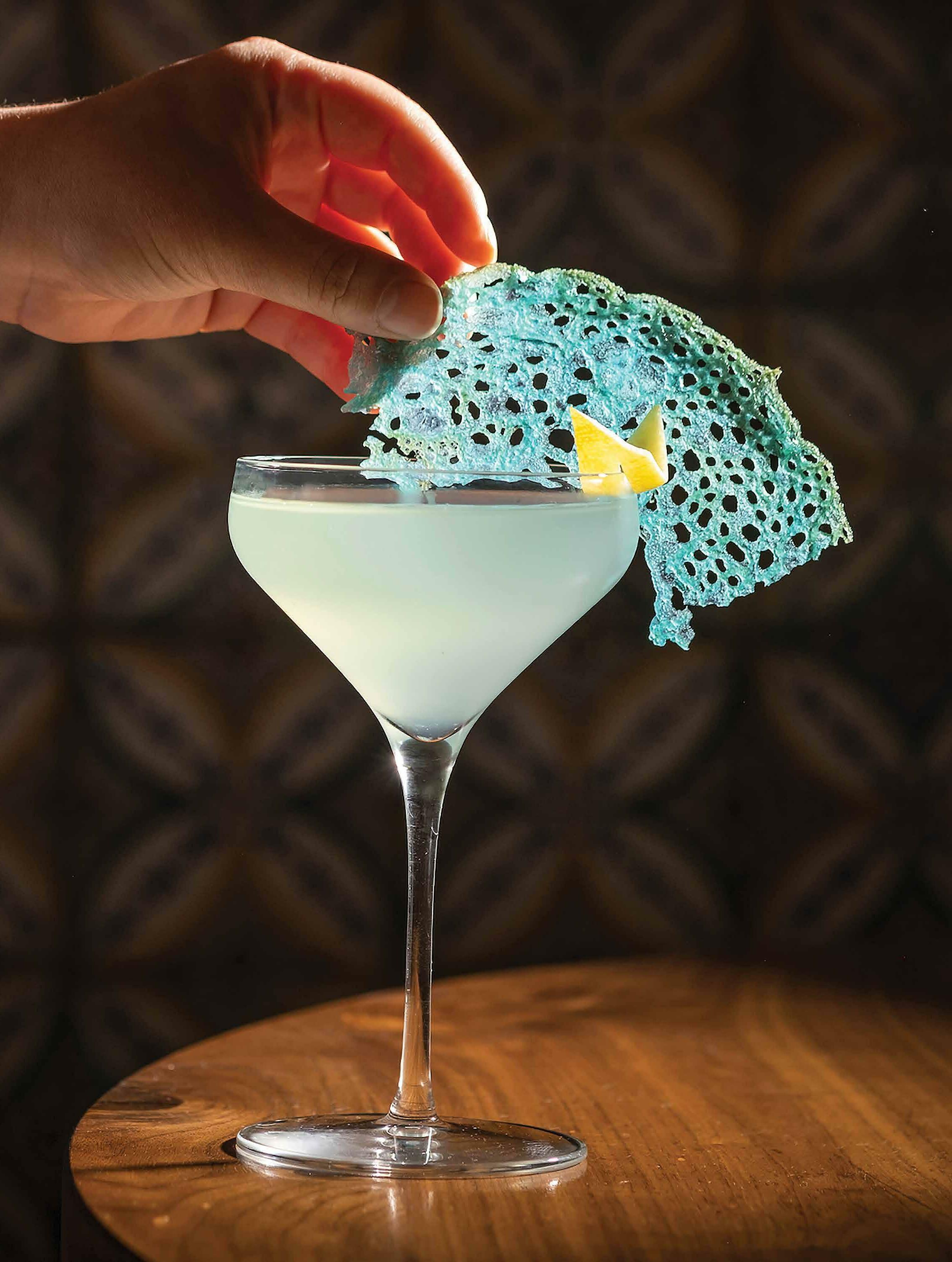 WAVE INGREDIENTS 2 oz. of Yaegaki Junmai Sake 1 oz. lime juice 3/4 oz. simple syrup 4-6 mint leaves Lemon peel with slit and mint sprig or edible tuile (for garnish)