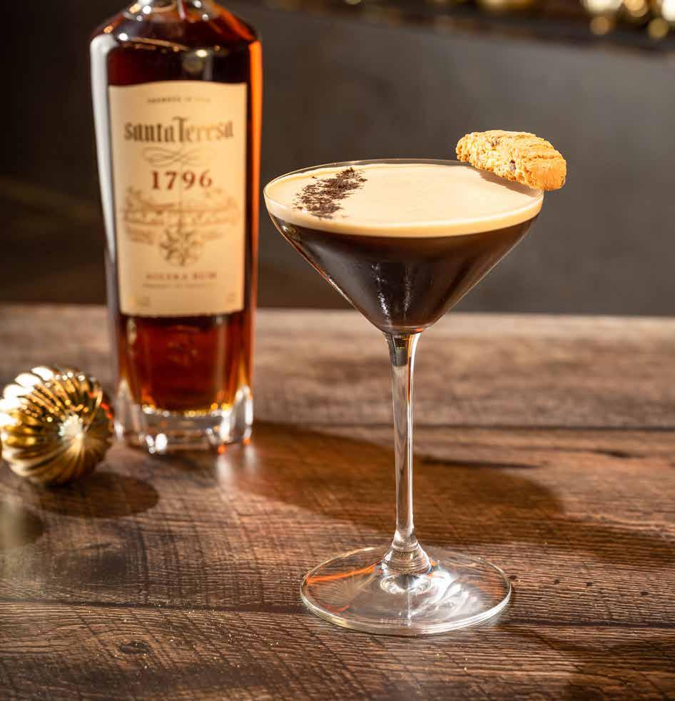 Add all ingredients in shaker tin, add ice, shake vigorously, then strain in Coupe glass. Garnish with grated coffee bean and serve with biscotti cookie on the side.