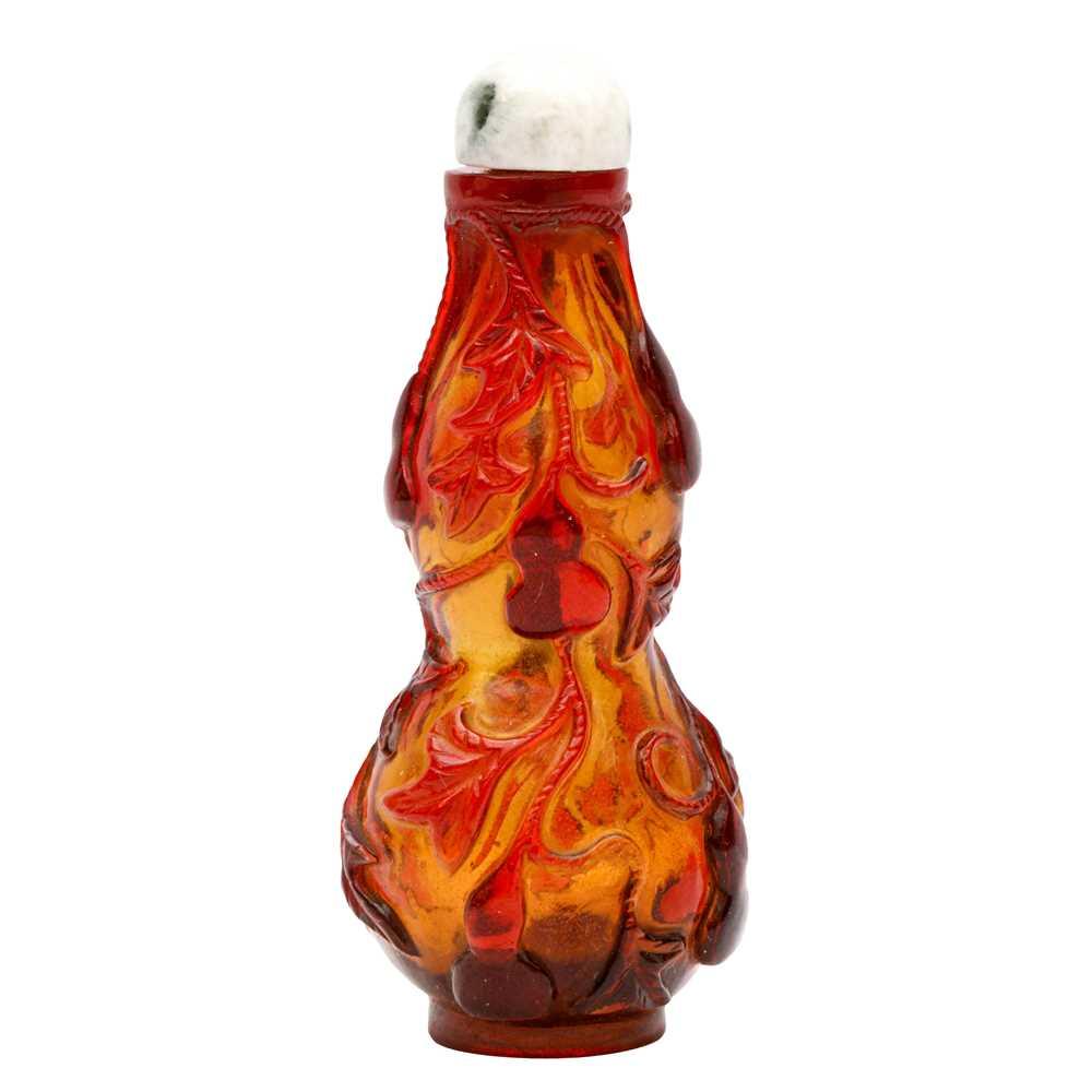 Comprising a globular vase of squat form with a red grown, one side depicting a large rose bloom; the other in grey/back opaque ground decorated with a stylised peony flower scroll (Dimensions: 27cm; 15.5cm) (Qty: 2) £400-500