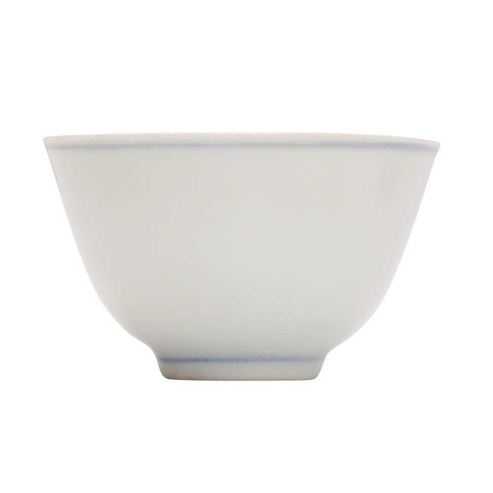 十七世紀 青花盃 青花《大明成化年製》楷書款 The finely potted cup with flared sides and a short foot with an underglaze blue band at the edge of the rim and also where the top of the foot meets the body, the base with a Chenghua mark