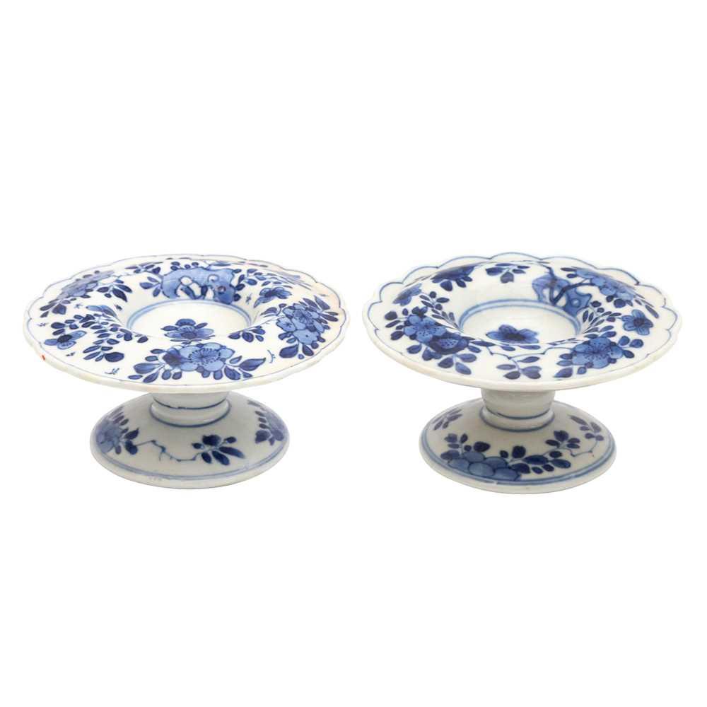 清康熙 青花花口鹽罐 一對 Each formed with a foliate rim enclosing a donut-shaped protusion leading into a rounded well, supported by a knopped stem terminating by a splayed base, painted with prunus sprays and flowerheads