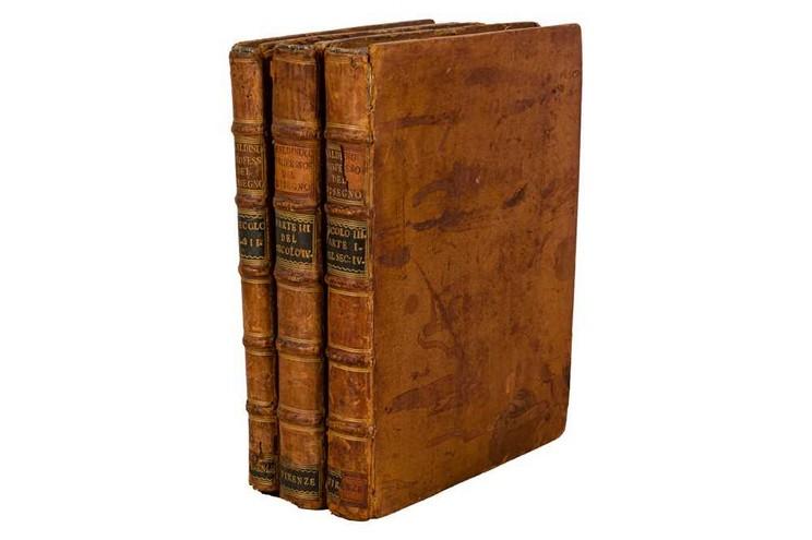 Notizie de' professori del disegno da Cimabue in qua, 3 parts only, of 6 (secolo 1 & 2, First Edition; secolo 3 part 1, secolo IV, parte 2), woodcut device on title with Medici arms in vol. 1, engraved title vignettes in vv. 2- 3, large folding genealogical table in vol.1 and an engraved portrait of the author by Petr. Rotari Veron. dated 1726 in vol. 3, light age yellowing, occasional light spotting and foxing throughout, a little water staining, vol. 2 inscribed by Jacopo Sanzanini, extensive manuscript note to front free ednpaper in vol. 3 & some marginalia in a contemporary hand, uniformly bound in calf, small repair to one vol., marbled endpapers, a little rubbed and stained, Santi Franchi, 1681, Giuseppe Manni, 1702, Tartini & Franchi, 1728 engraved, 4to, Florence (3)