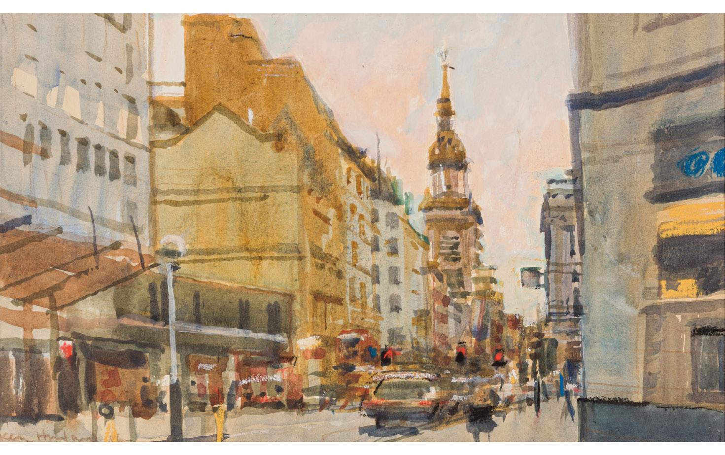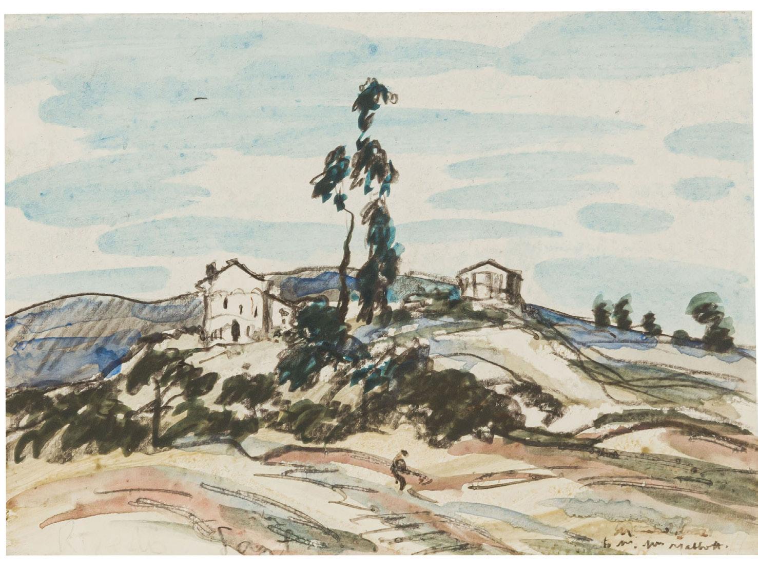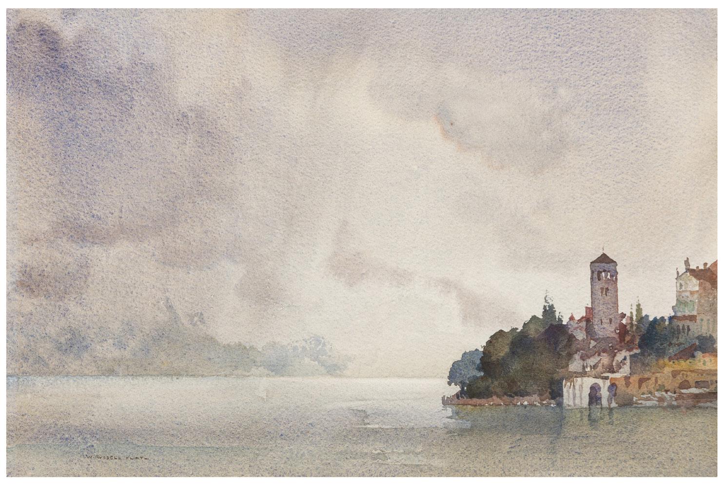 The Island Campanile, Orta, Italy signed ‘W. RUSSELL FLINT’ (lower left); further signed and inscribed ‘The Island Campanile, Orta/W Russell Flint’ (on the backboard) watercolour