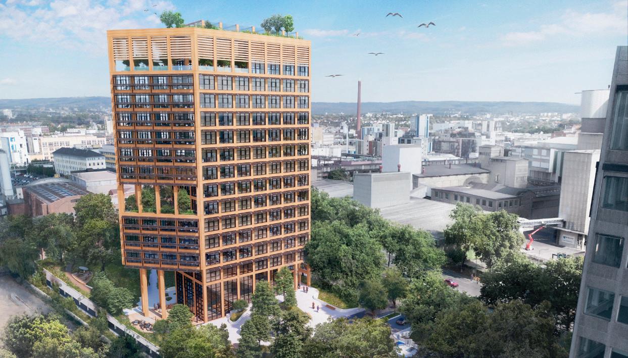 The H2-Office-Tower is part of a redevelopment site located on Wiesbaden's Rhine riverfront that serves as a model for sustainable, smart and future-oriented urban development.