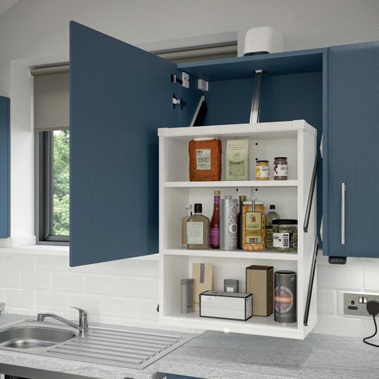 Supplied as a complete cupboard for ease of installation on site, the ActivMotion Glide Wall Unit features collision detection to prevent hands getting trapped or damage to any objects on the worktop. The cupboard is available in 500 and 600mm widths and has three shelves, with a middle shelf that is height adjustable or removable as needed. Shelf rail guards are also fitted as standard. The unit also comes with a lifetime guarantee on the carcass and two-year guarantee on moving parts.