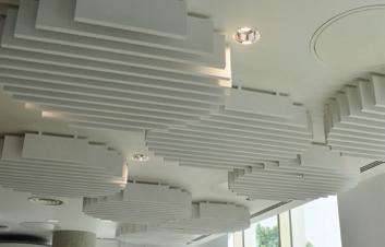 The most economic method of using Whisper is as vertical hanging baffles in an interior space. Whisper absorbs sound on both sides, so baffles enable minimum product for maximum absorption. However, it can also be used as ceiling rafts where total available height in a space is restricted.