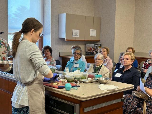 Nearly 50 members and guests filled the conference room at PMRI as we learned, tasted, and planted alongside our enthusiastic culinary and gardening presenters. The fun and engagingvibe was evident throughout the day, all centered around our JB Cause 2025: Food is Medicine. Dr. Katelyn Fritzges’ presentation, An Introduction to Culinary Education, was a big hit.We had the pleasure of watching her prepare two nutritious and delicious salad dishes, which delighted both our eyes and our palates.
